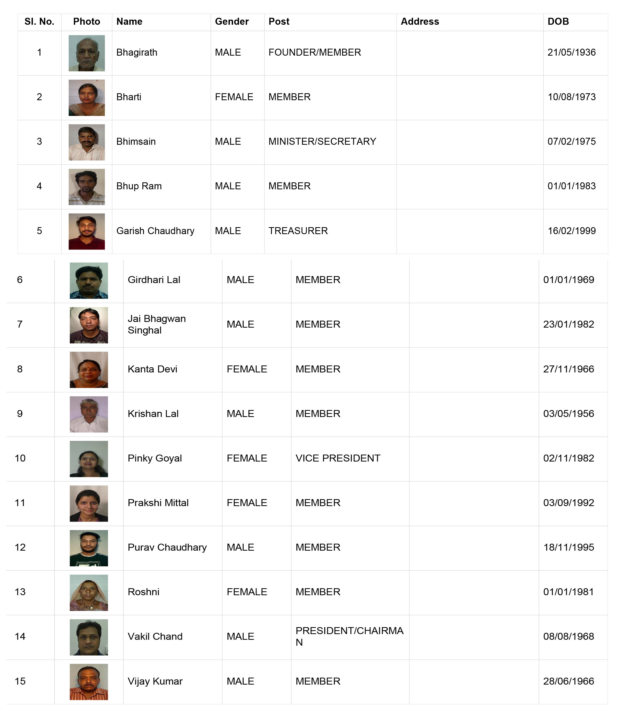 | S No. | PHOTO | Name | Gender | Post | Address | DOB | UID No. | |